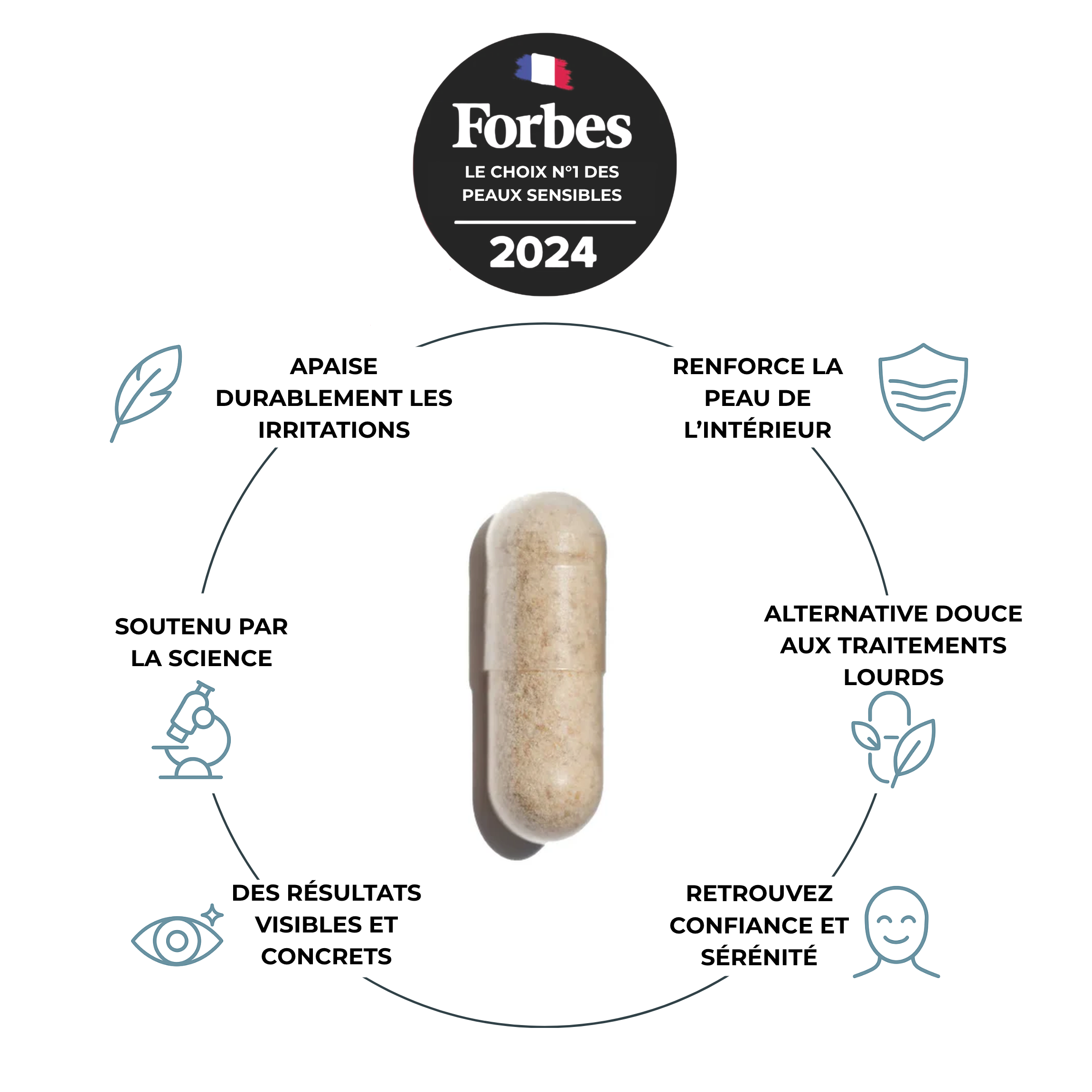 Chaque capsule agit de l’intérieur pour réduire les rougeurs, la sécheresse et les poussées d’eczéma ou de psoriasis.